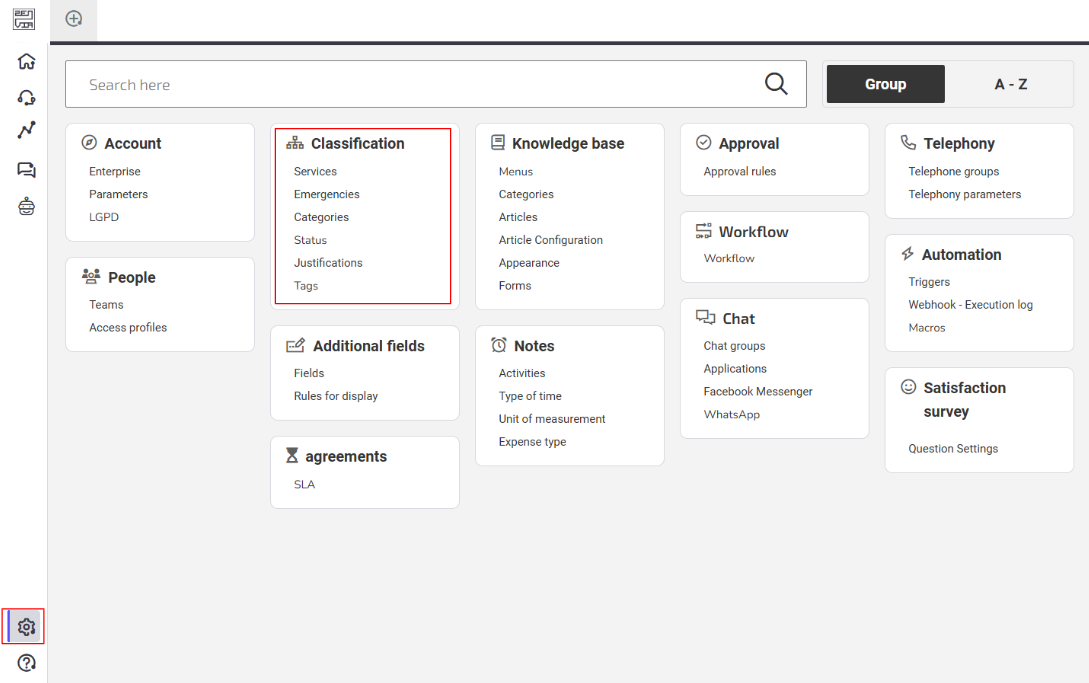 The configuration of the Classification is one of the initial steps for using the Support Attendance module in Zenvia Customer Cloud.