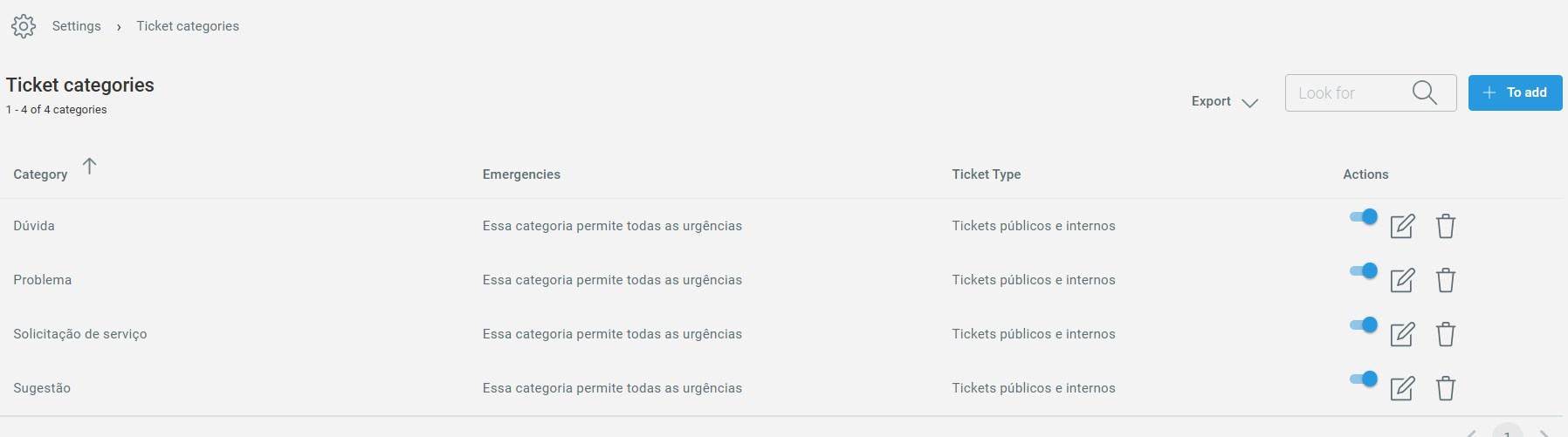 Urgencies determine the priority of tickets, helping agents identify the severity of each case. They are associated with Categories and can be adjusted as needed.