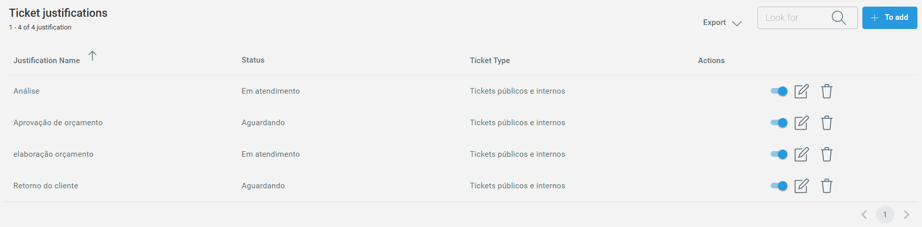 To access this feature, go to Support > Settings > Justifications. On the main screen, you will see the default suggested options, which can be customized according to your business needs.