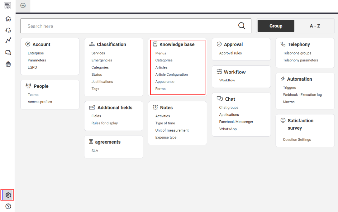 To set up and manage the Knowledge Base in your Zenvia Customer Cloud account, go to Support > Settings > Knowledge Base:
