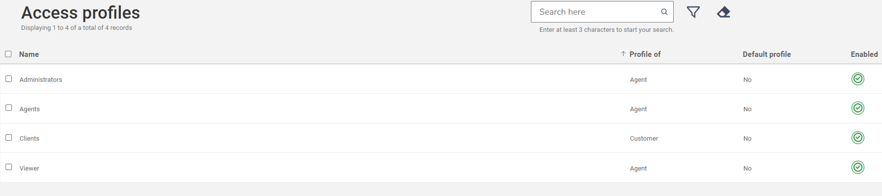 In the access profiles section, you can define permissions for Administrators, Agents, Customers, and Viewers.