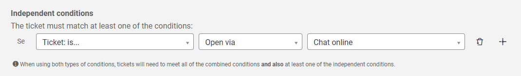 In the example image below, the field Opened via of the ticket must be equal to Online Chat. This means that for the ticket to appear in the view, it must meet at least one of the defined conditions. This feature is useful when you want to include tickets with varying statuses, as long as at least one of them meets one of the configured criteria.