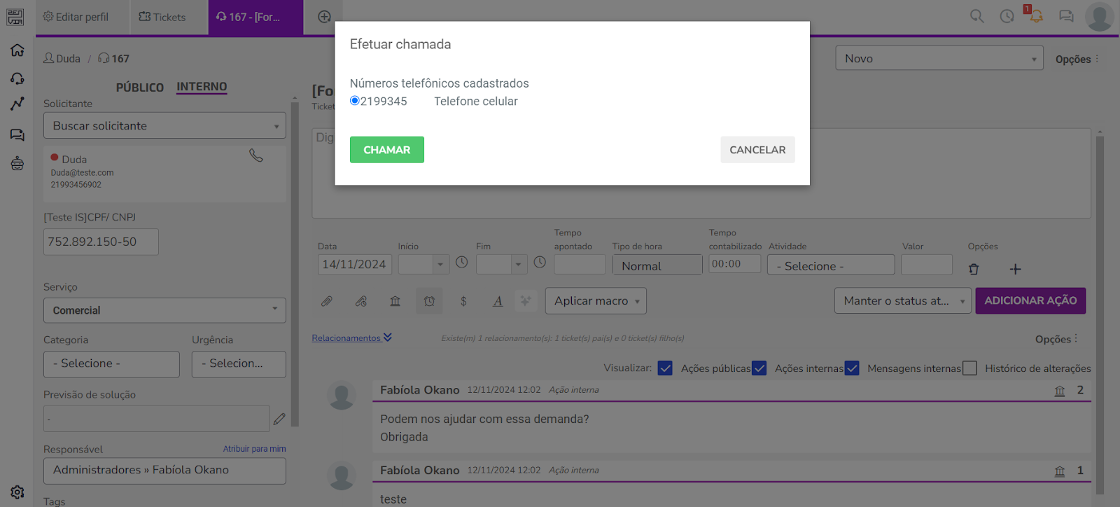 ⚠️ Attention: If you don’t associate the ticket with the desired contact, the call will still be charged, but its context won’t be linked to the ticket — only to the outbound call log in Zenvia Voice.