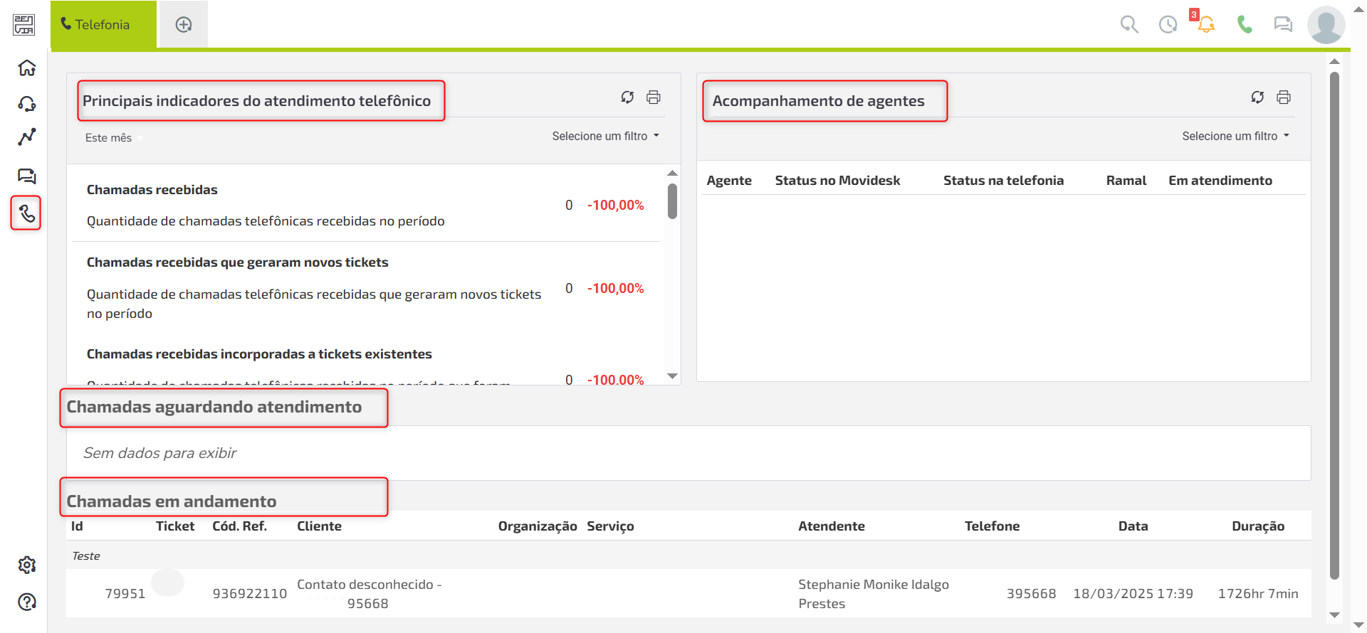 The Telephony feature allows support agents to receive and make calls directly through Zenvia Customer Cloud. These calls can be converted into new tickets or linked to existing ones, offering greater control and service history.