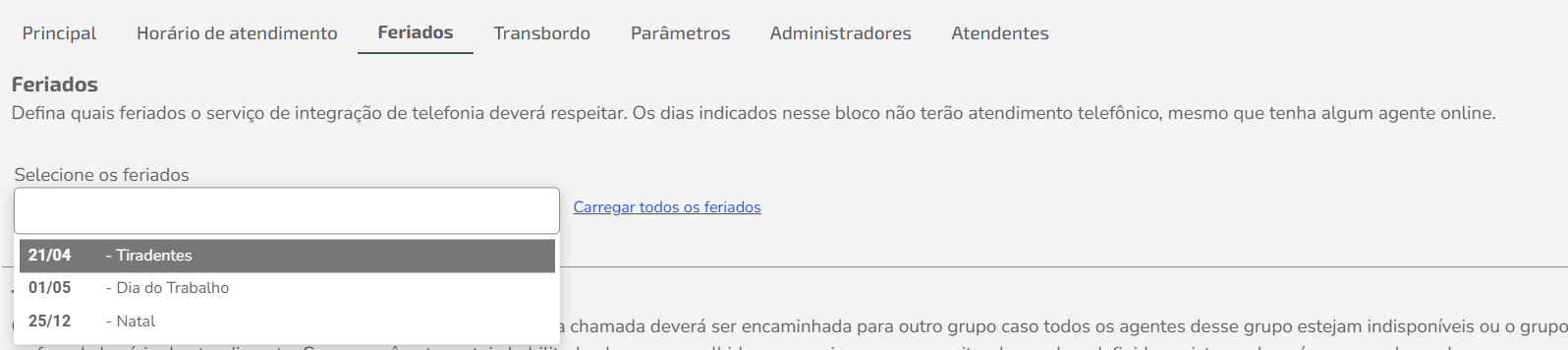 Holidays: Load holidays during which calls should not be received. On these days, no phone service will be provided, even if agents are online. Use the Load all holidays option to include all holidays registered in the system. You can register new holidays in Settings > SLA > Holidays.