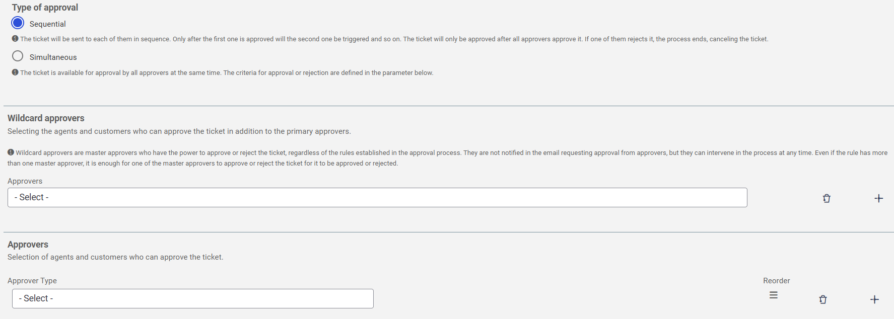 The Approval Rules allow defining criteria for tickets to be processed only after approval by one or more individuals, which can be a specific collaborator, someone with a certain role, or the requester’s superior.