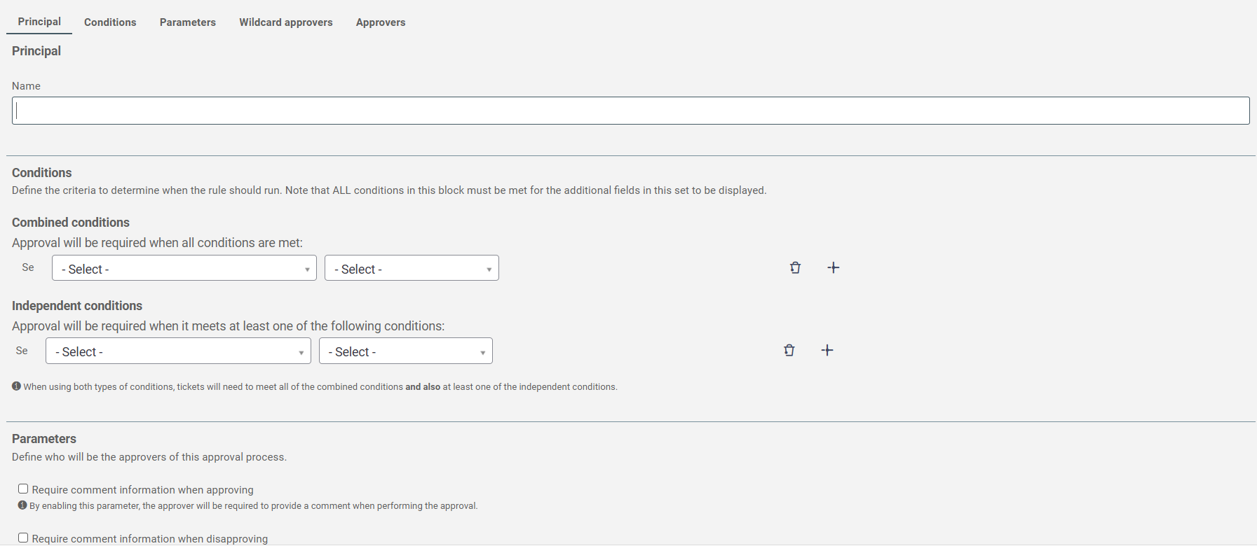 The Approval Rules allow defining criteria for tickets to be processed only after approval by one or more individuals, which can be a specific collaborator, someone with a certain role, or the requester’s superior.