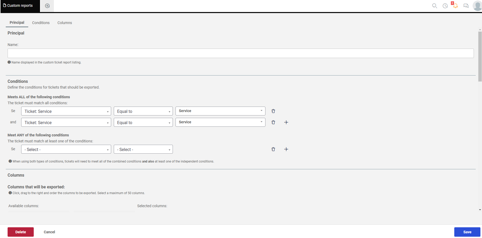 3. Define the conditions (Optional). The conditions determine which tickets will be included in the report. You can choose between two types of logic to filter the tickets.