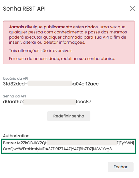 - Use only the data from the Authorization field. It is not necessary to use the "API User" and "API Password" fields, as "Authorization" already contains the encoded information.
