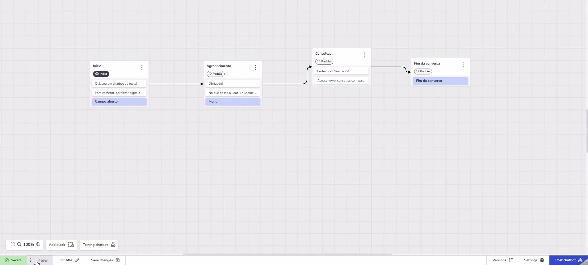 1. On the chatbot creation screen, look for Flow in the bottom left corner and click it.