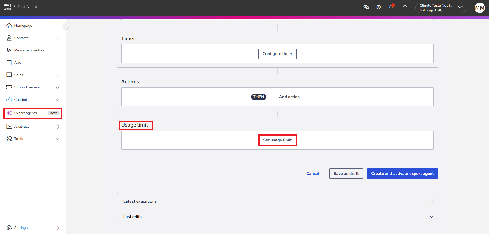 - Limit Usage: When enabling this option, you can define the number of interactionz, renewed monthly, for the expert agent.