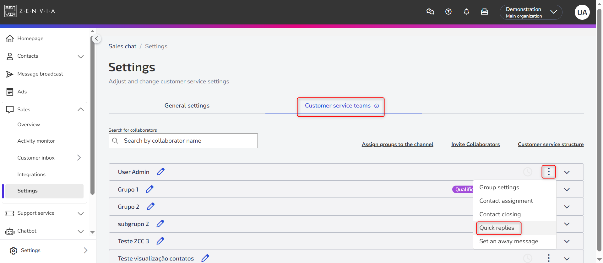 - Go to Sales > Settings > Customer service teams >