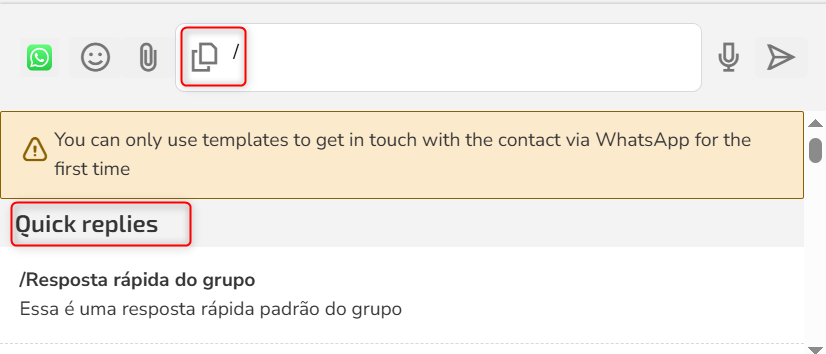 During an interaction with a contact, quick replies can be accessed by agents directly in the inbox, facilitating communication and standardizing responses.