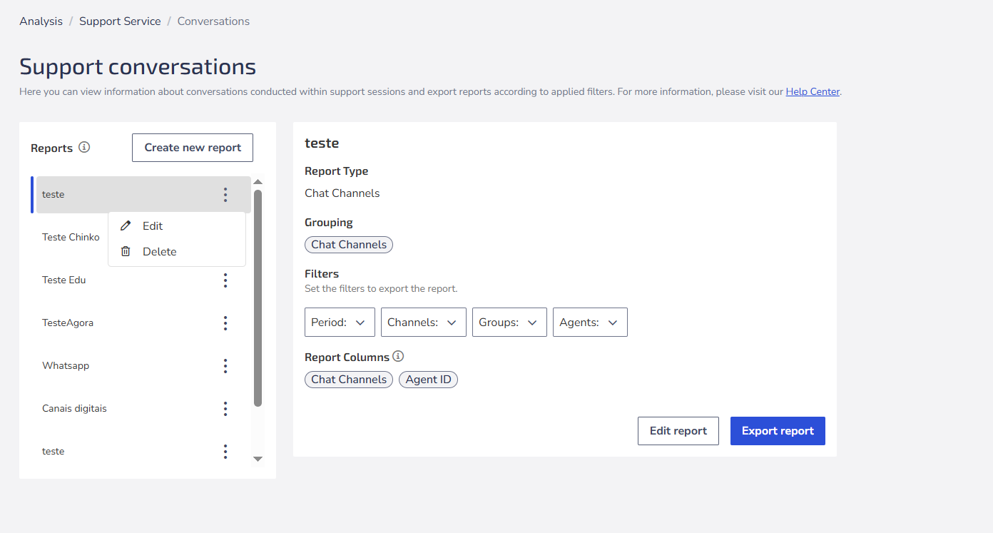 The Support Conversations report from Zenvia Customer Cloud provides detailed information about the conversations handled by the Support team. Use it to analyze and generate comprehensive reports on chat-based support interactions. Reports can be exported according to the applied filters.