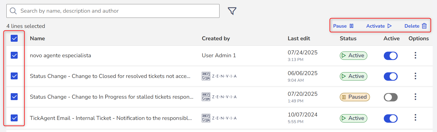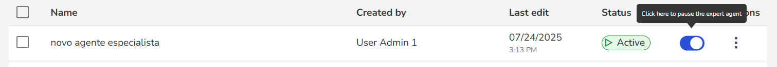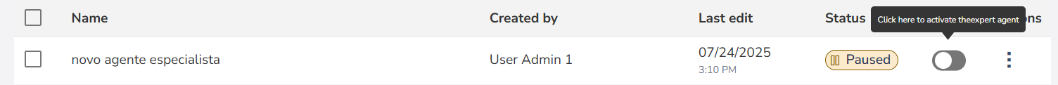 💡 Tip: You can activate, pause, and delete multiple support expert agents at once. Just select the desired agents and choose the action at the top of the agent list.