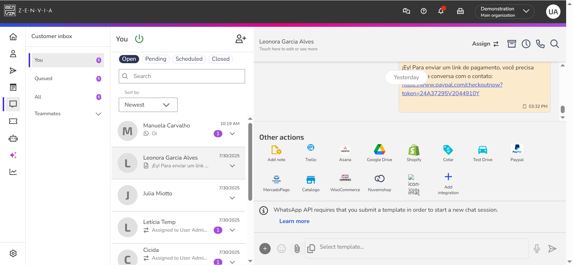 Functional integrations are used directly within the sales customer inbox of Zenvia Customer Cloud.