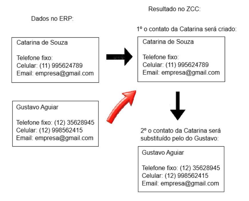1. You update a contact in the management system with a mobile, landline, or email that already exists in Zenvia Customer Cloud. During synchronization, the contact's old data in Zenvia Customer Cloud is completely replaced with the new information from the management system.