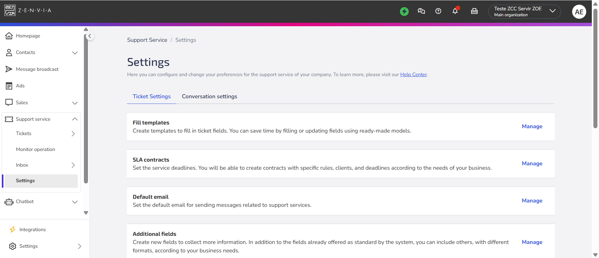 Support service > Settings > Ticket Settings > Fill templates > Manage.