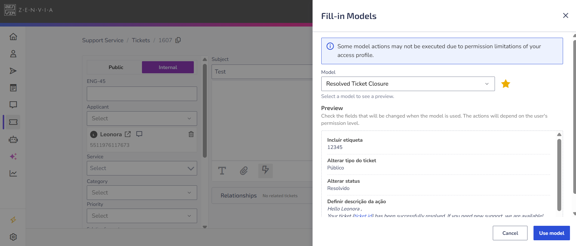 | Define action attachments | Attaches files to the action automatically when the model is applied. ⚠️ Attention: After applying the model, it is necessary to confirm the saving of the action in the ticket. |