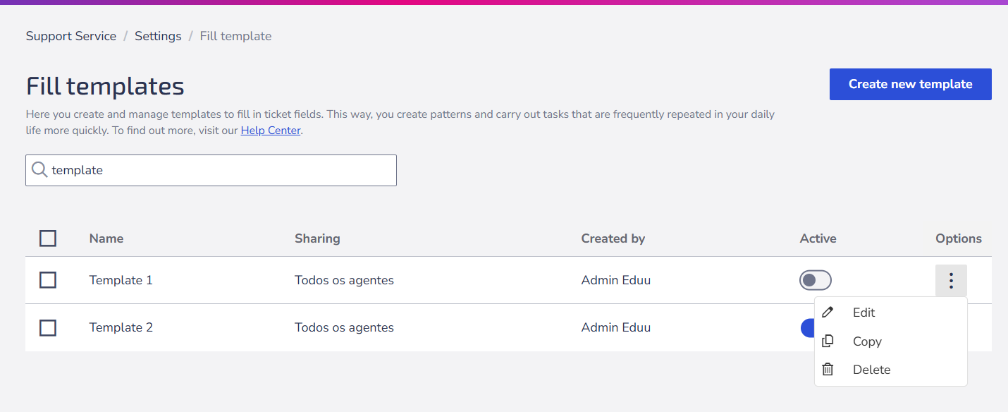 Support service > Settings > Ticket Settings > Fill templates > Manage.