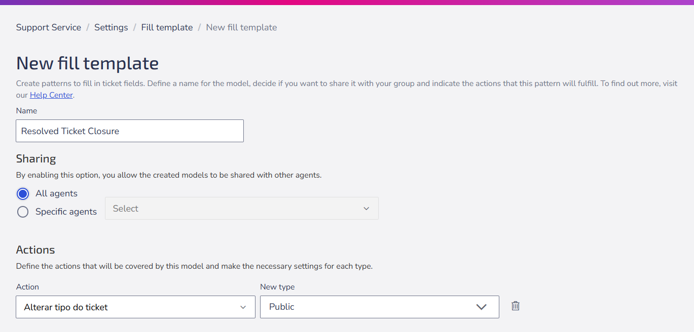 | Define action description | Automatically inserts text into the body of the action, which may include **custom fields** and text formatting. ⚠️ Attention: After applying the model, the agent must confirm the saving of the action in the ticket. |