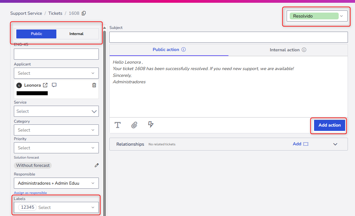 Change priorityDefines the ticket priority (low, medium, high, urgent), assisting in the management of the service queue.