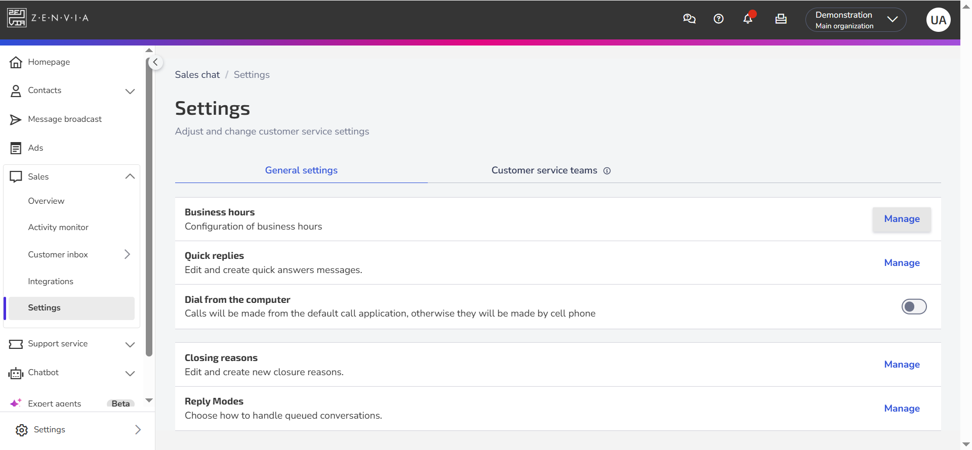 Learn how to set up business hours in Zenvia Customer Cloud, including weekdays and start and end times for the shifts.