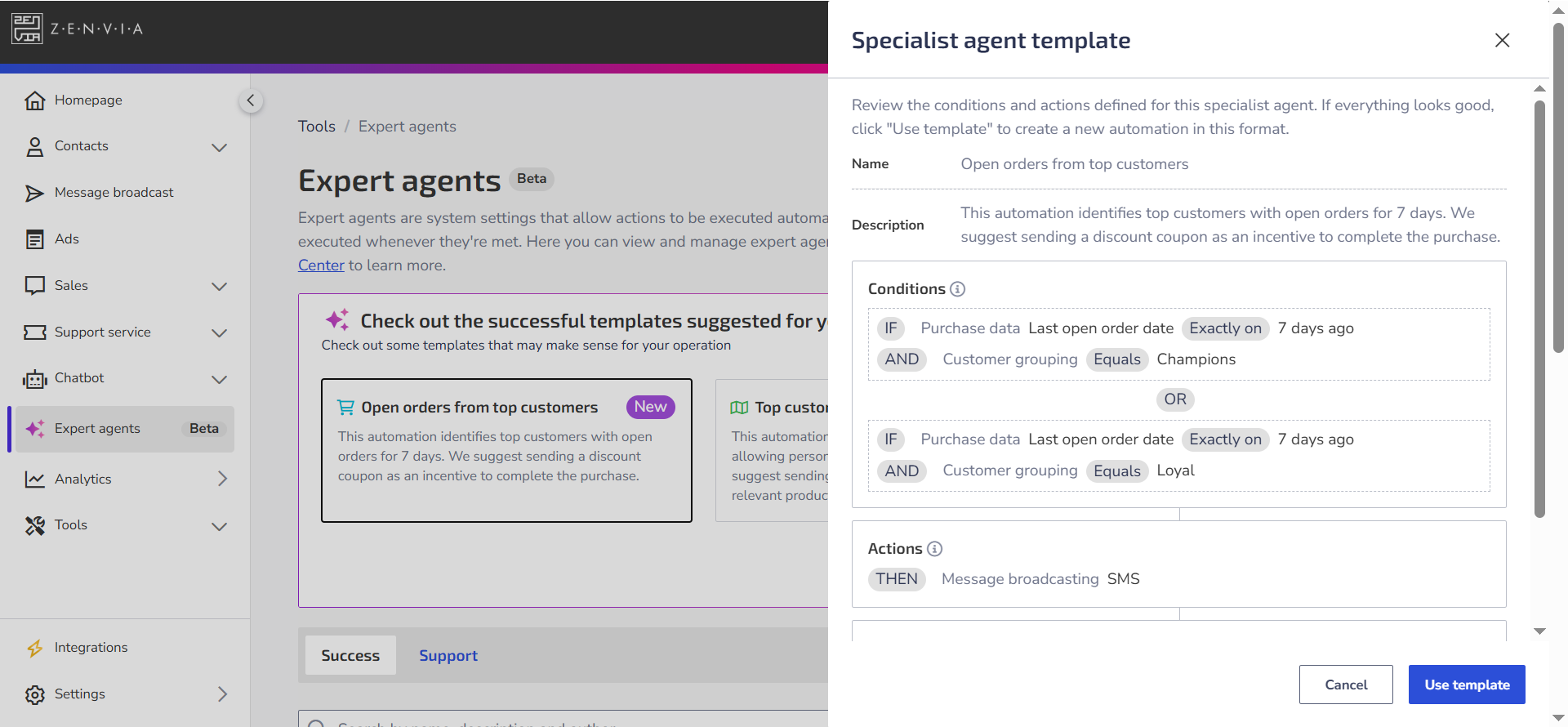Create agents that perform automatic actions based on the customer’s profile or behavior. This is a strategic automation focused on targeted, high-value actions, unlike marketing automation, which is more general and mass-oriented.