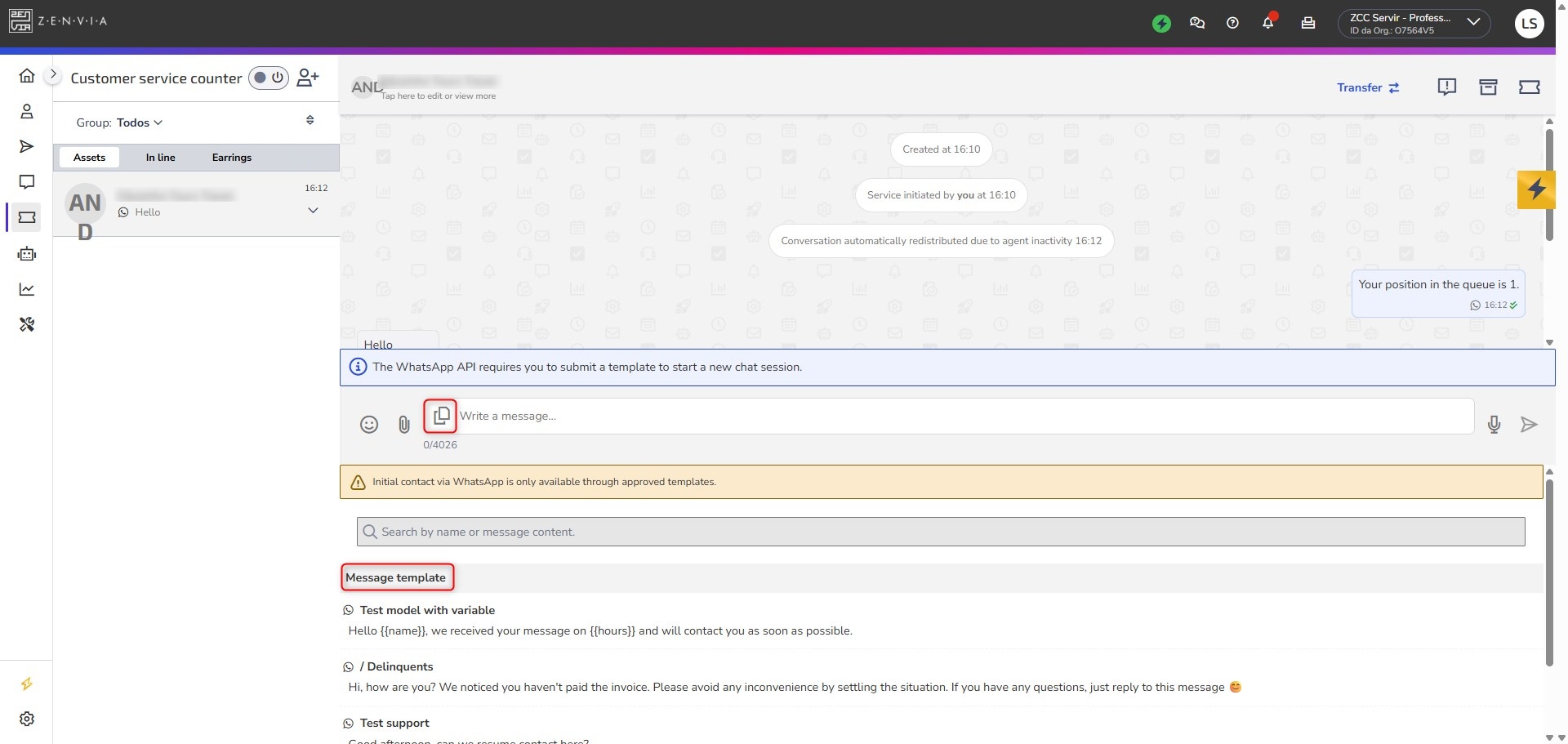 - If no template is configured for the WhatsApp number, the message cannot be sent and the support interaction cannot continue through this channel.