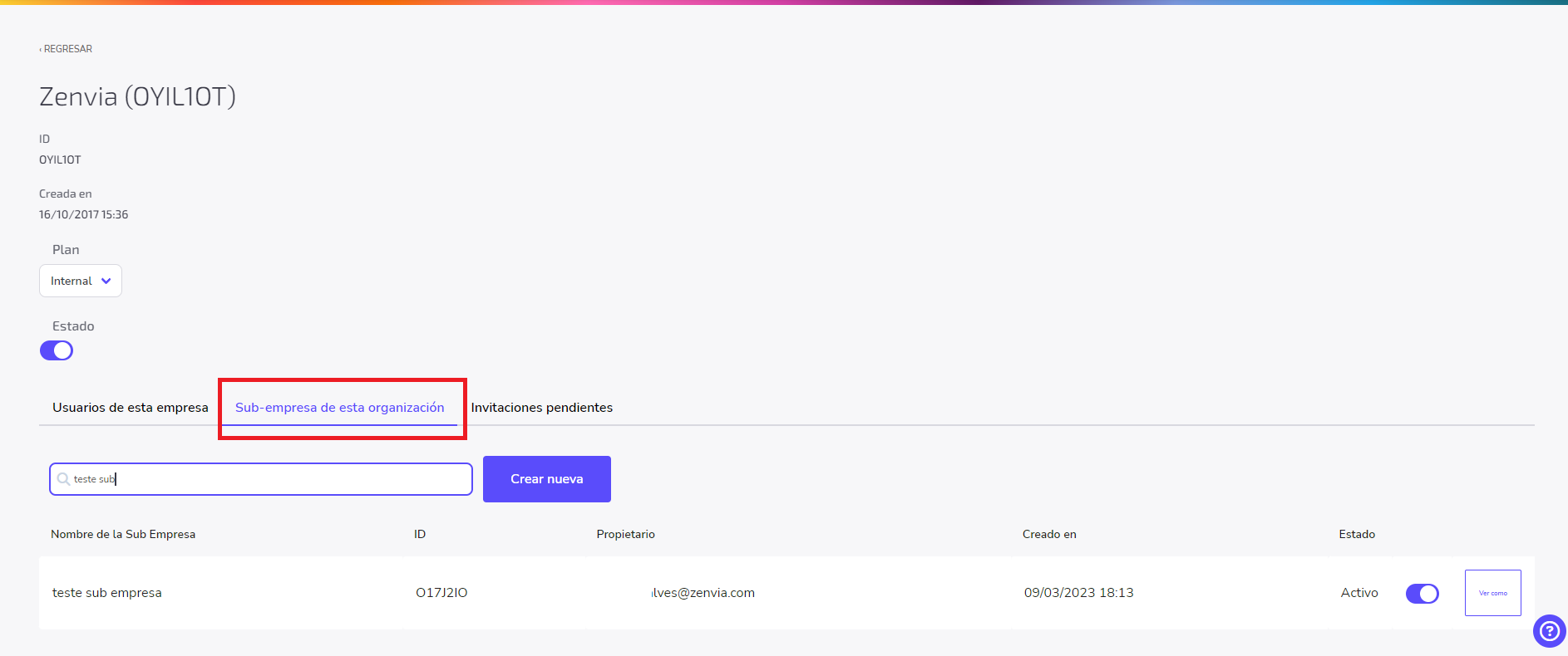 5. ¡Listo! La suborganización creada podrá verse al final de la página, en Sub empresa de esta organización.
