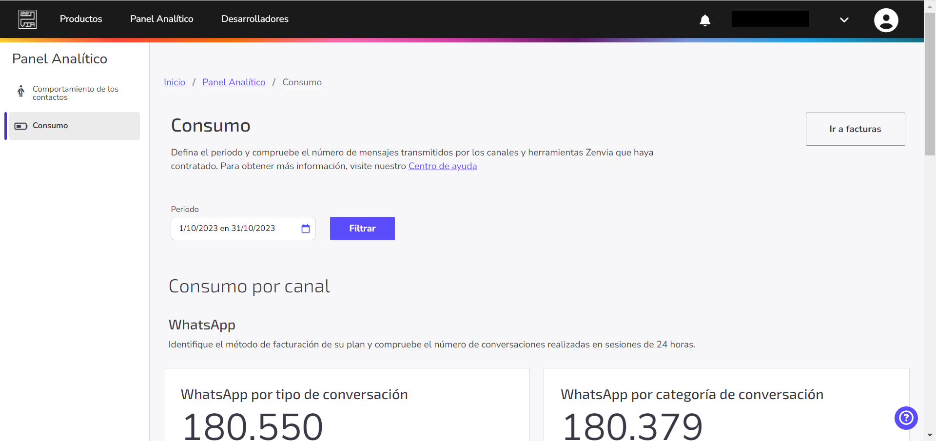 El panel de consumo le permite monitorear los mensajes que circulan a través de los canales y herramientas de Zenvia. De esta manera, puede realizar un seguimiento del volumen de uso de los servicios contratados por su organización y verificar las estimaciones de facturación para un período específico.