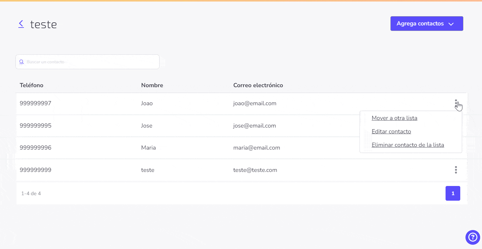 Ahora, veamos las opciones disponibles en el botón  que se aplican a cada contacto de la lista seleccionada.