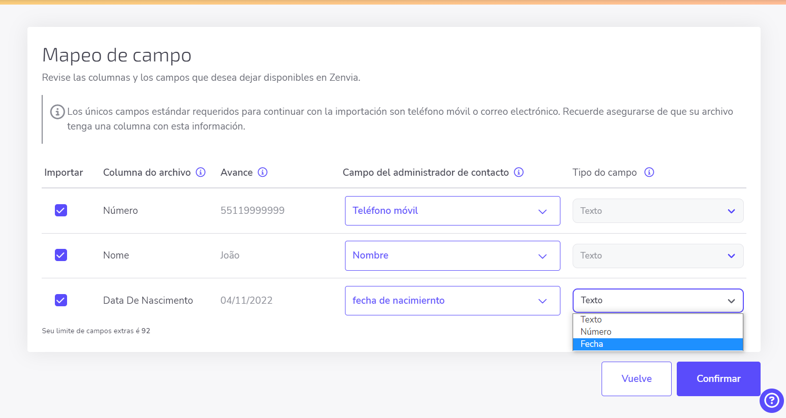 ⚠️ Atención: La creación de campos extras está disponible tan solo para contactos añadidos vía importación de archivos. El límite de creación de campos extras es 100 por organización y cada uno puede ser usado en otras importaciones.