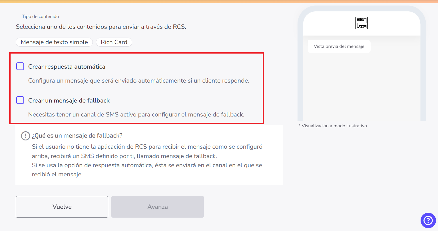5. Además, también existe la posibilidad de registrar un mensaje fallback, que tiene la función de enviar un mensaje alternativo para clientes que no estén aptos a recibir el RCS en su dispositivo.