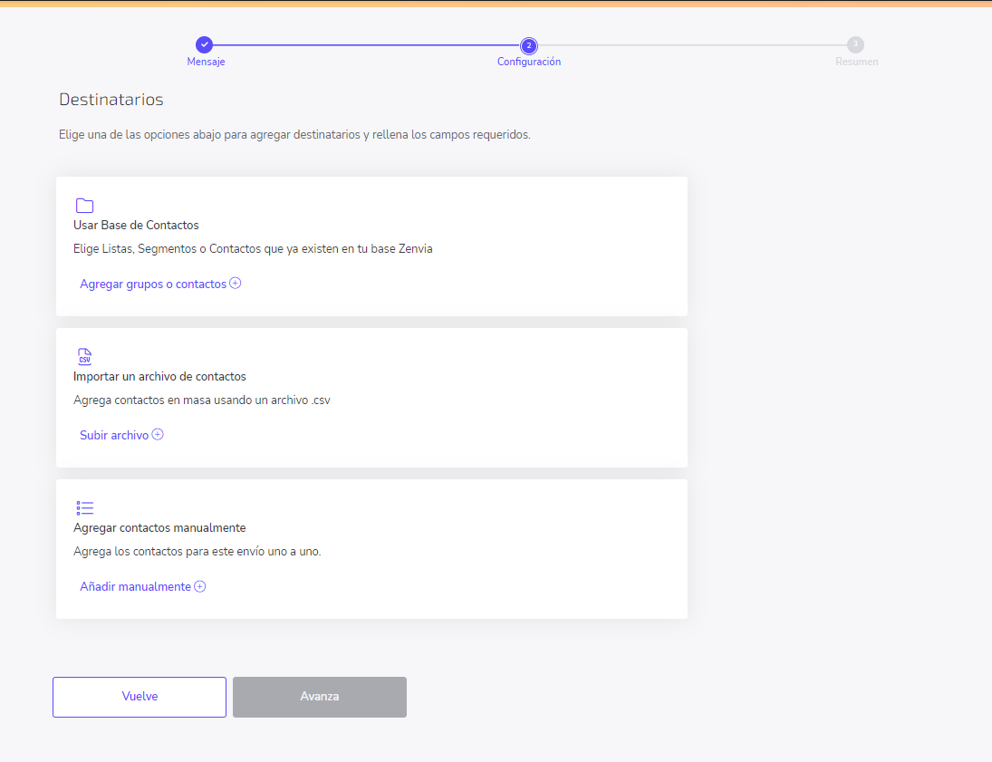 En esta etapa, debes definir los destinatarios de los mensajes. Hay tres opciones: