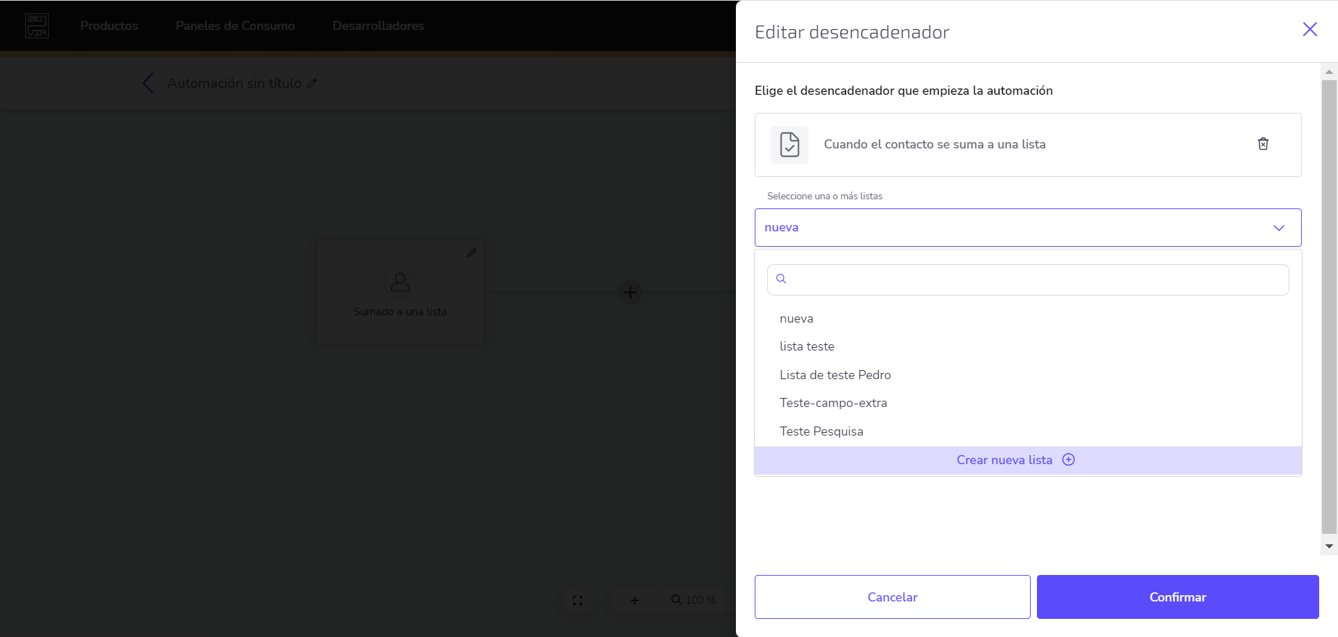 En esta ventana puedes añadir listas extras a través de la caja de selección o borrar una lista utilizada haciendo clic en el ícono ubicado en cada tag de lista. Para finalizar la incorporación (o remoción) de las listas, haz clic en Confirmar.