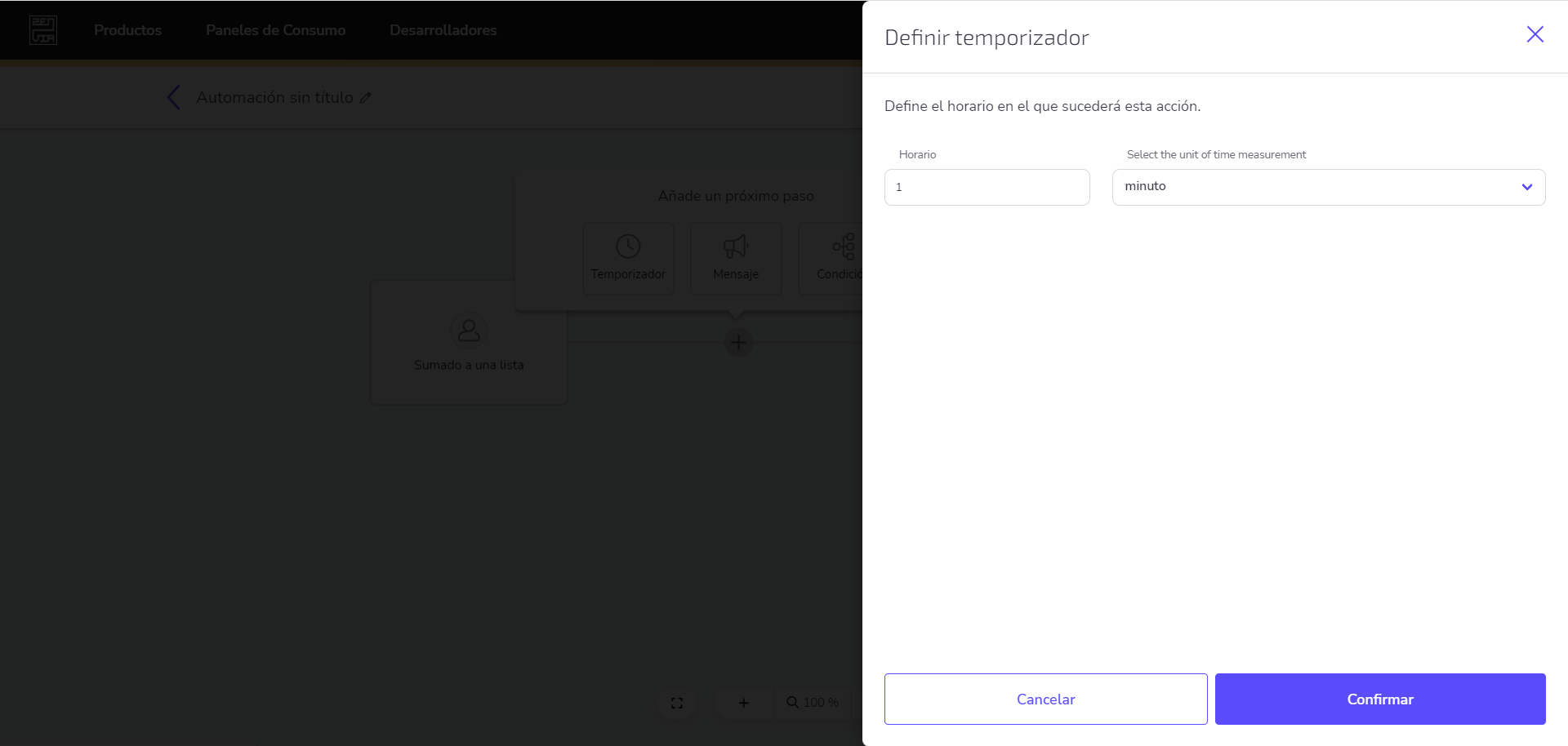 Al seleccionar la opción Temporizador, puedes configurar el tiempo que será considerado por el sistema. En el campo Tiempo, coloca el número de tiempo y en la caja de selección, define la unidad temporal, que puede ser: