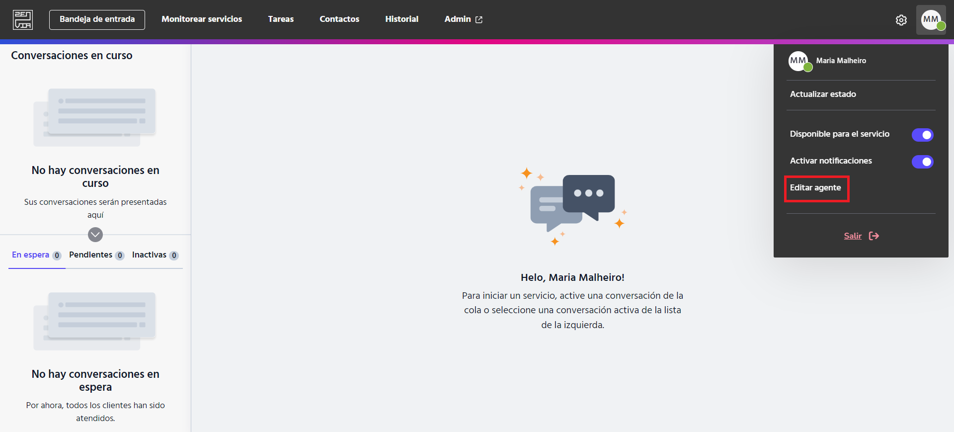 Para cambiar la imagen de perfil, simplemente accede a Zenvia Chat - Perfil de Agente y haz clic en Editar agente en la esquina superior derecha.