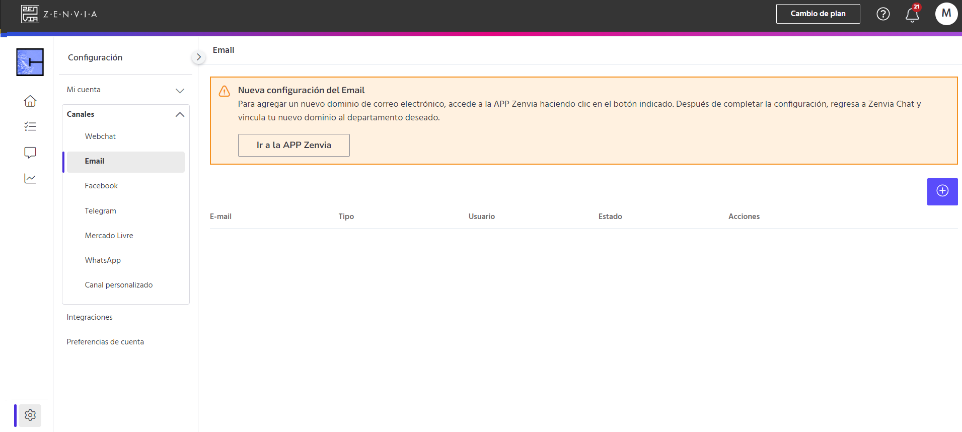 Después de configurar tu email en la APP Zenvia, añade tu dominio de email al departamento deseado aquí en Zenvia Chat. Para ello, haz clic en +.