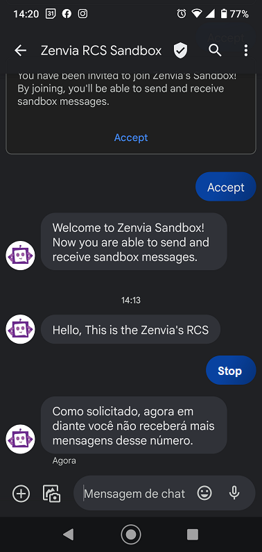 Cada vez que un usuario recibe un mensaje RCS, tiene la opción de responder 'pare', 'stop', 'parar', 'não quero', 'sair', 'sai', para no recibir más estos mensajes. Como se demuestra a continuación: