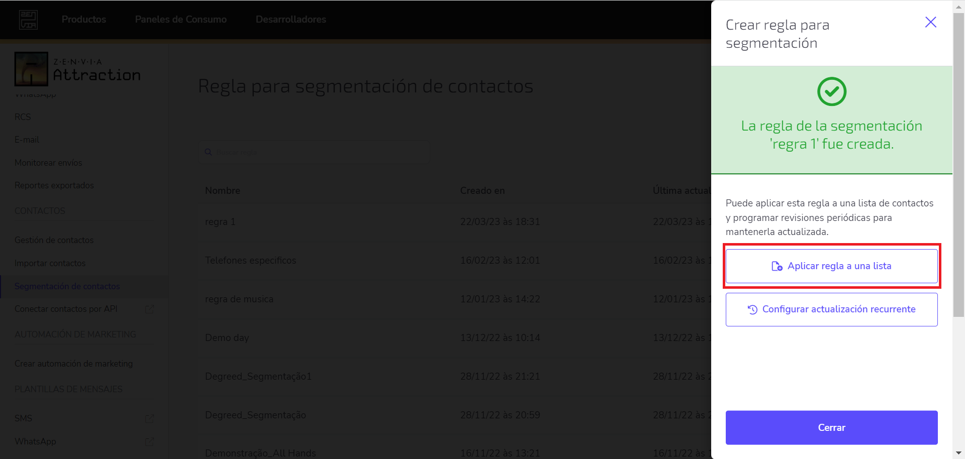 💡 Sugerencia: Reglas para segmentar contactos configuradas para ser actualizadas periódicamente también pueden ser asociadas a una regla de comunicación.