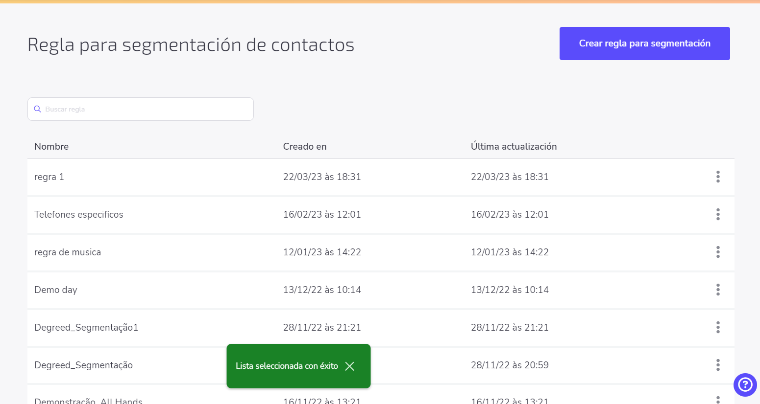 Ahora, si una regla ya no se utiliza, puede eliminarla de la lista. Para hacerlo, en la lista de reglas para segmentación de contactos, haz clic en el botón botaoo.png que corresponde a la lista que quieres editar y selecciona la opción Eliminar. Luego, confirma que te gustaría excluir la regla haciendo clic sobre el botón rojo Borrar regla.