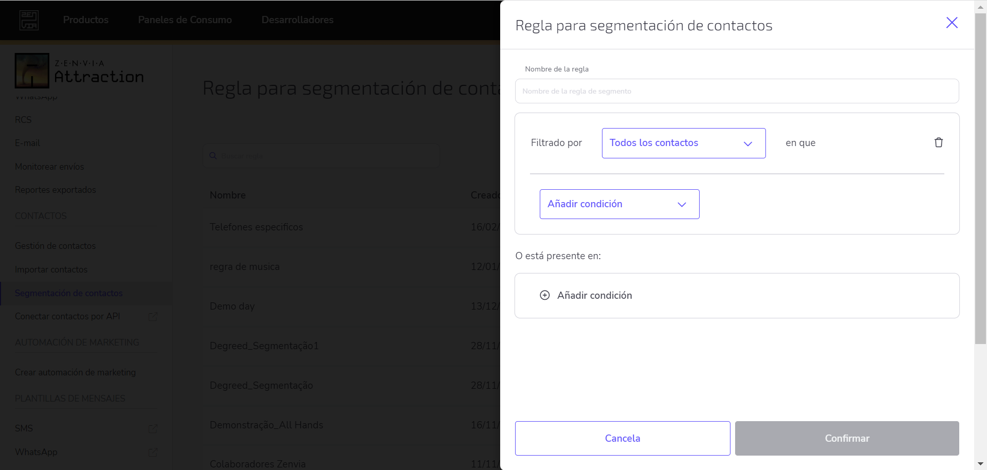 6. Para finalizar y guardar la regla de segmentación, haz clic en Confirmar.