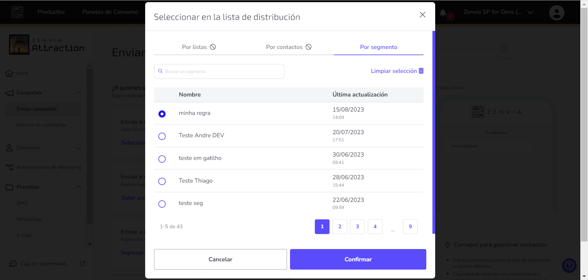2. Luego, haz clic en la pestaña Por segmento para elegir cuál de las reglas de segmentación de contactos se utilizará. Una vez seleccionada la regla deseada, haz clic en Confirmar;