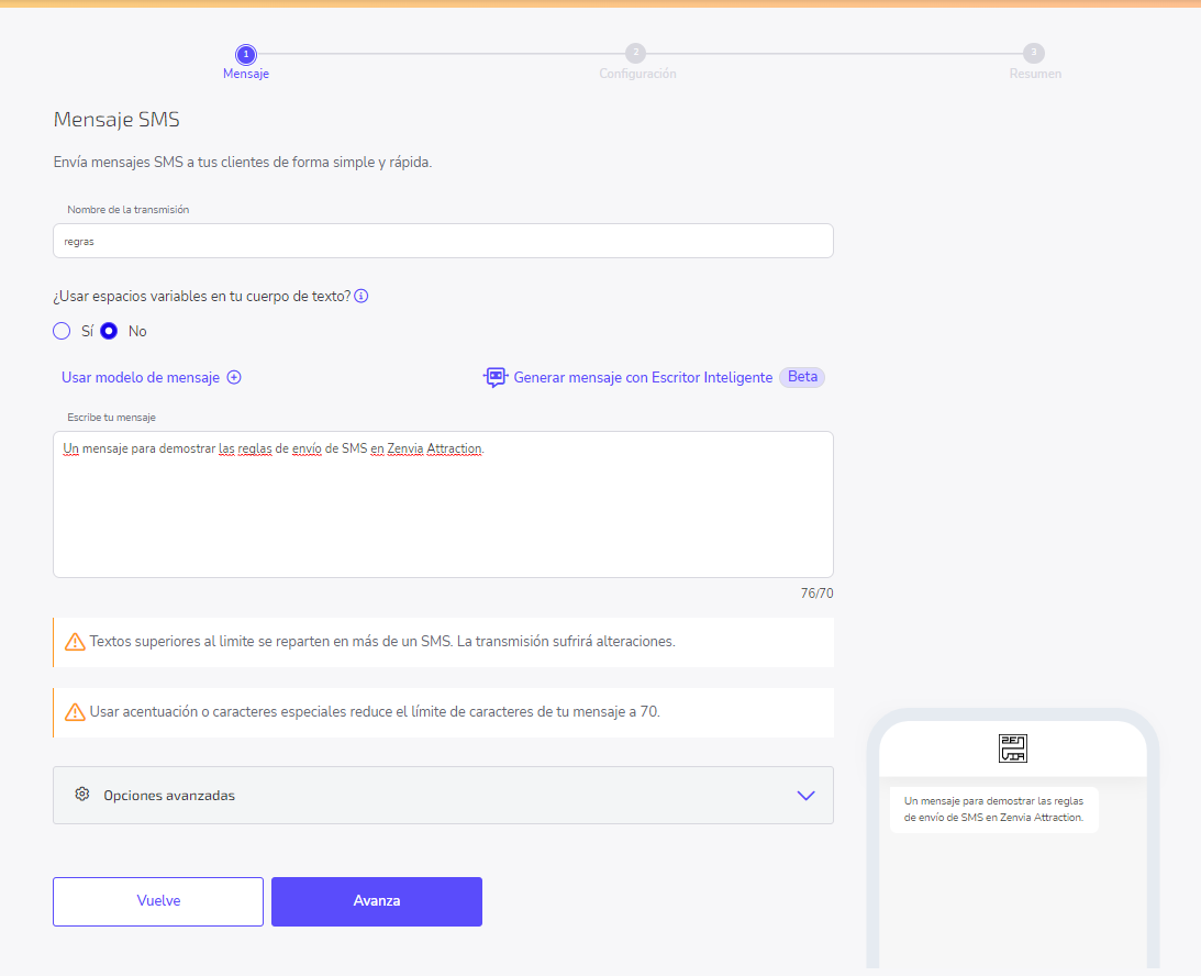 La primera etapa para enviar una campaña de SMS en Zenvia Attraction es escribir el mensaje. El modelo de texto para un SMS es de 160 caracteres, pero esta cantidad puede ser mayor por medio de los mensajes concatenados, o sea, la entrega de varios mensajes juntos en un único SMS para el destinatario. El mensaje será fragmentado en la cantidad de envíos necesarios para que llegue todo el contenido.
