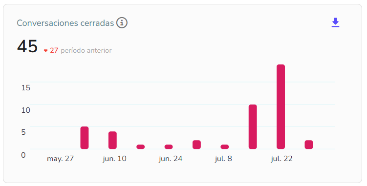 Mira cuántas conversaciones cerró tu equipo durante el periodo seleccionado. Las conversaciones se cierran cuando los contactos se cierran, archivan o transfieren.