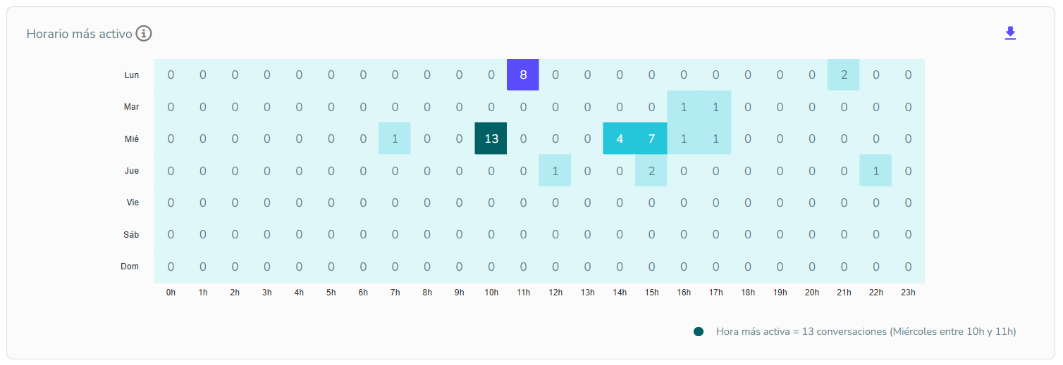 Este gráfico es un mapa de calor que muestra los días y horas con más conversaciones activas. Con estas métricas, puedes distribuir mejor las horas de trabajo de tu equipo.