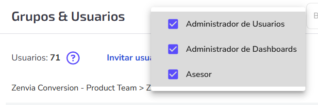 Rol de un usuario y organización del Grupo de Zenvia Conversion