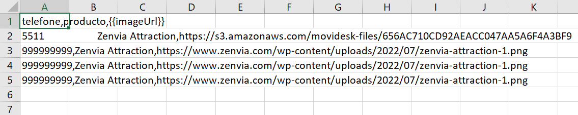 El archivo debe contener una columna para el teléfono y otra con la URL del archivo de medios (en el ejemplo, la URL es de una imagen). Además, debe estar en formato .csv.