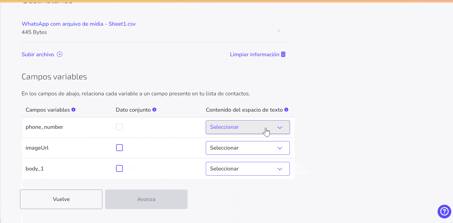 A continuación, asocia las variables a los respectivos campos. Independientemente de cómo se definieron los destinatarios, si un mensaje tiene una variable, es necesario seleccionar lo que representa cada campo de la tabla.